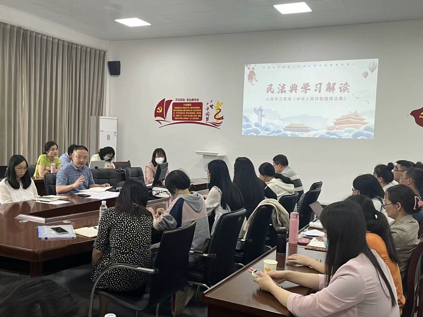王伟才同志首先阐述了《民法典》编纂的四大重大意义、总体要求和五个基本原则,接着讲解了《民法典》包括总则、物权、合同、人格权、婚姻家庭、继承、侵权责任7编共计1260条的主要内容。最后,结合我们日常生活对一些具有特点的案例进行了要点学习,包括:婚姻、婚内财产、出生继承权、土地使用权期满续期、用益物权、格式合同、高风险活动担责、隐私、公德、遗嘱等。