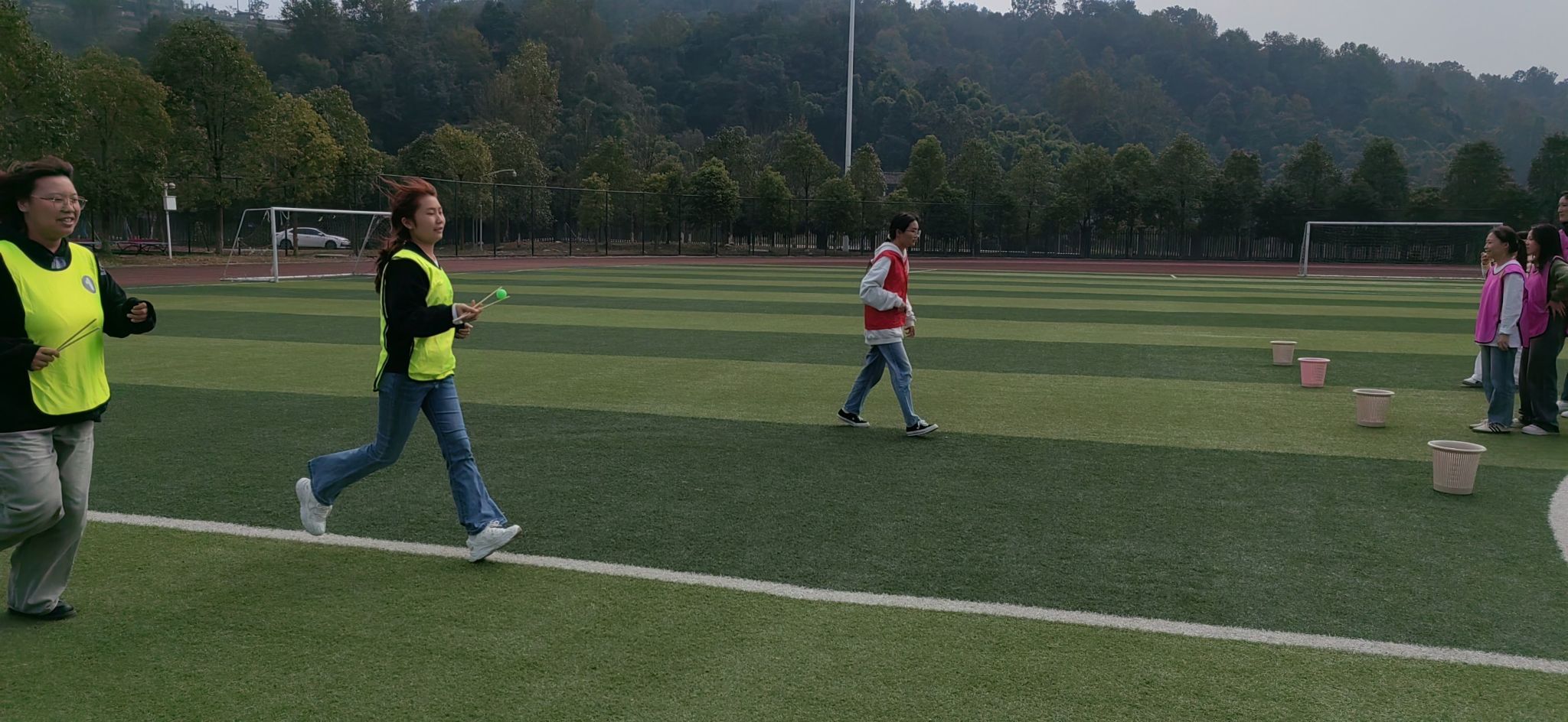本次“学思践悟 以学铸魂”知识竞赛暨趣味运动会以团队赛形式进行,共分为5组,各组指定一名组长。主持人讲解活动规则后,由各组长清点人数,完成答题后进行“背靠背”运球游戏;随后在羽毛球场和乒乓球场范围内寻找题目并作答;紧接着进行“极速传递”筷子夹乒乓球比赛,按顺序每个人夹一个乒乓球到规定的地方,所有人完成后跑步到达终点,由工作人员负责记录到达终点的顺序 ,并折算和计算得分,通过最终得分评选出一等奖1项、二等奖1项、三等奖3项,并在活动现场进行了颁奖。