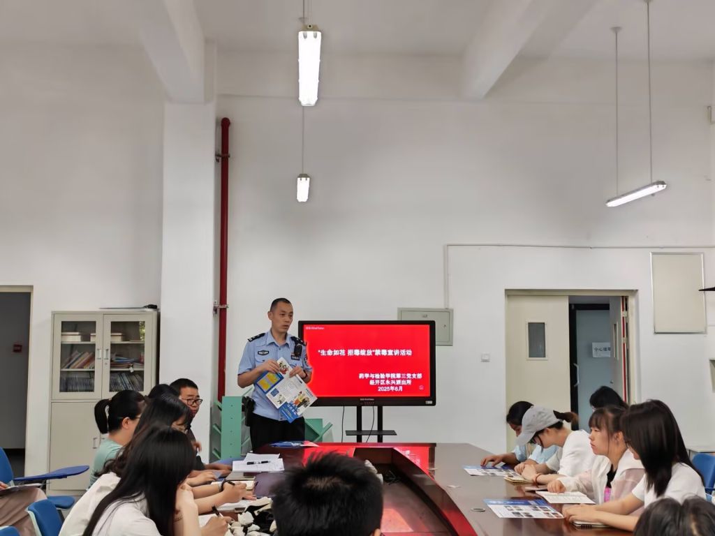2025年6月26日是第38个国际禁毒日,为进一步增强支部教师及入党积极分子的禁毒意识,提高识毒、防毒、拒毒能力,营造全民禁毒的良好氛围,上午10:30,药检公司第三党支部邀请经开区永兴派出所民警走进支部,在食品药品生产实训楼203开展了主题为 “生命如花,拒毒绽放” 的禁毒宣讲活动,支部教师、入党积极分子和各班员工代表共计56人参与此次活动。