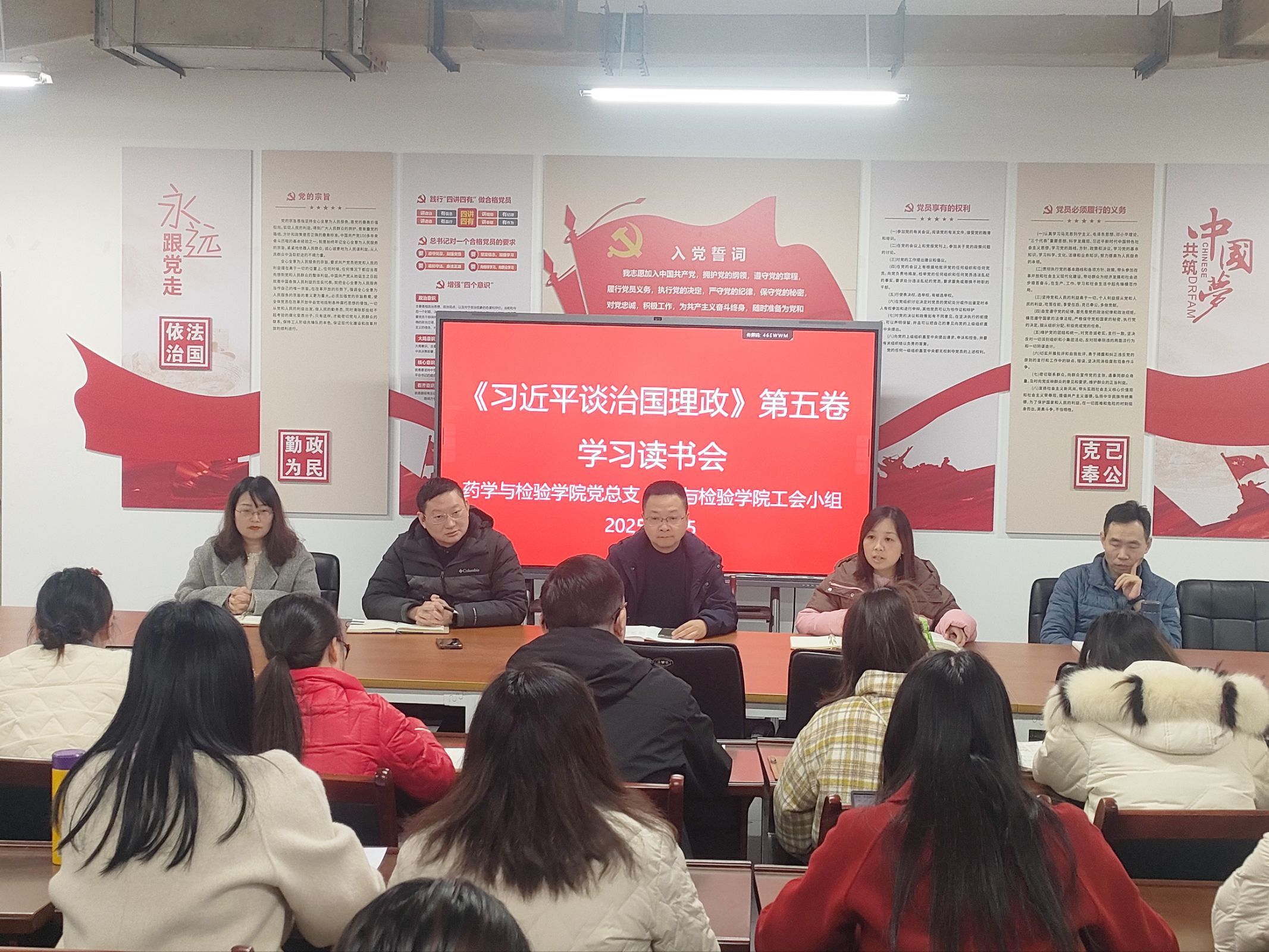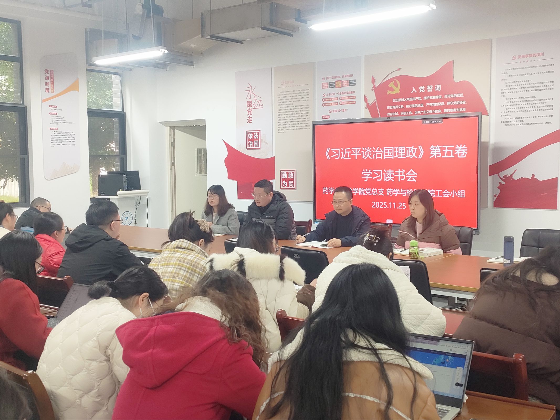 为深入学习贯彻习近平新时代中国特色社会主义思想,切实推动理论学习与专业实践深度融合,2025年11月25日太阳集团122cc工会小组联合药学与检验公司党总支在经开校区药学与检验楼105会议室,组织全院61名教职工开展《习近平谈治国理政》第五卷学习读书会。