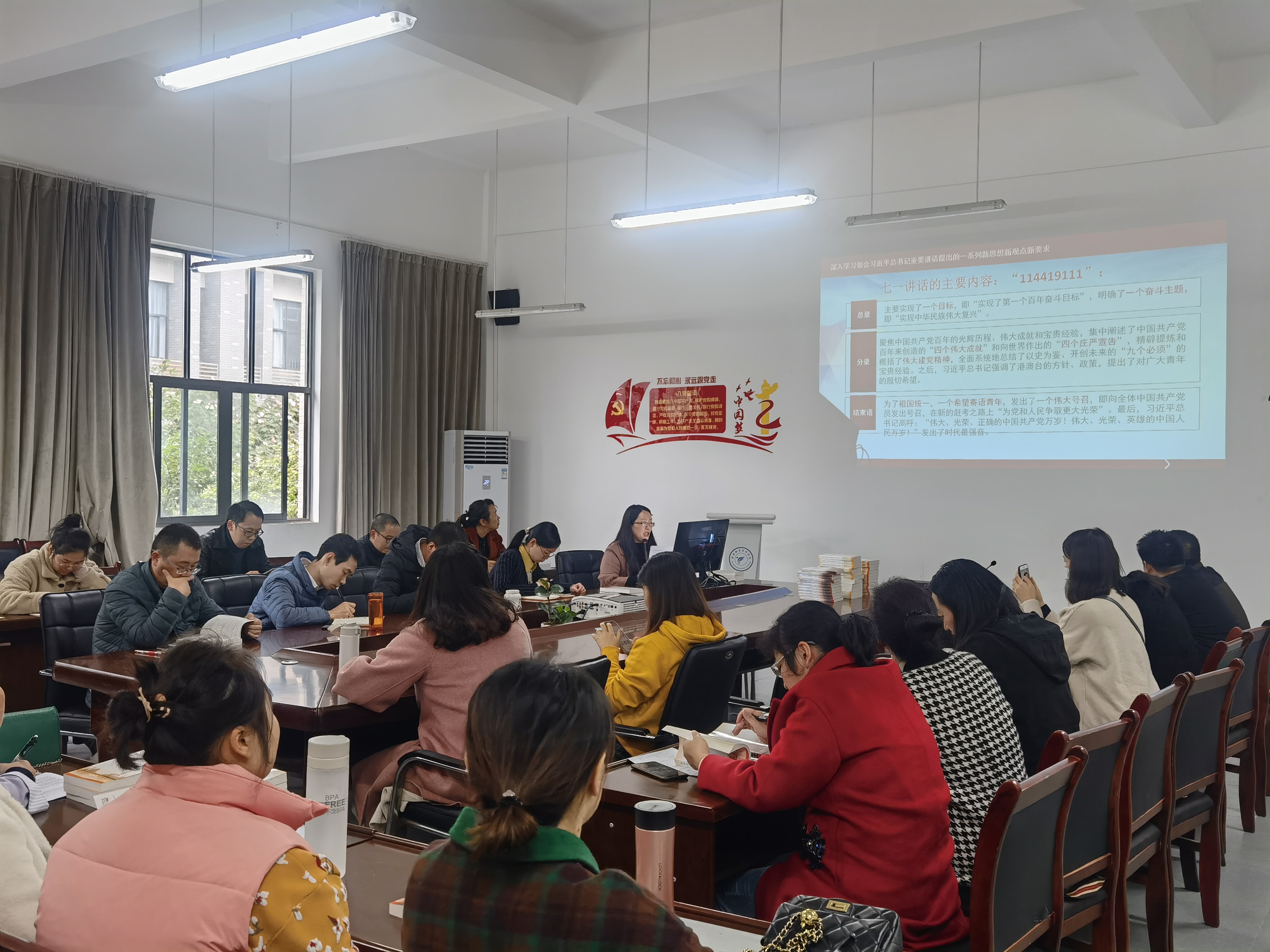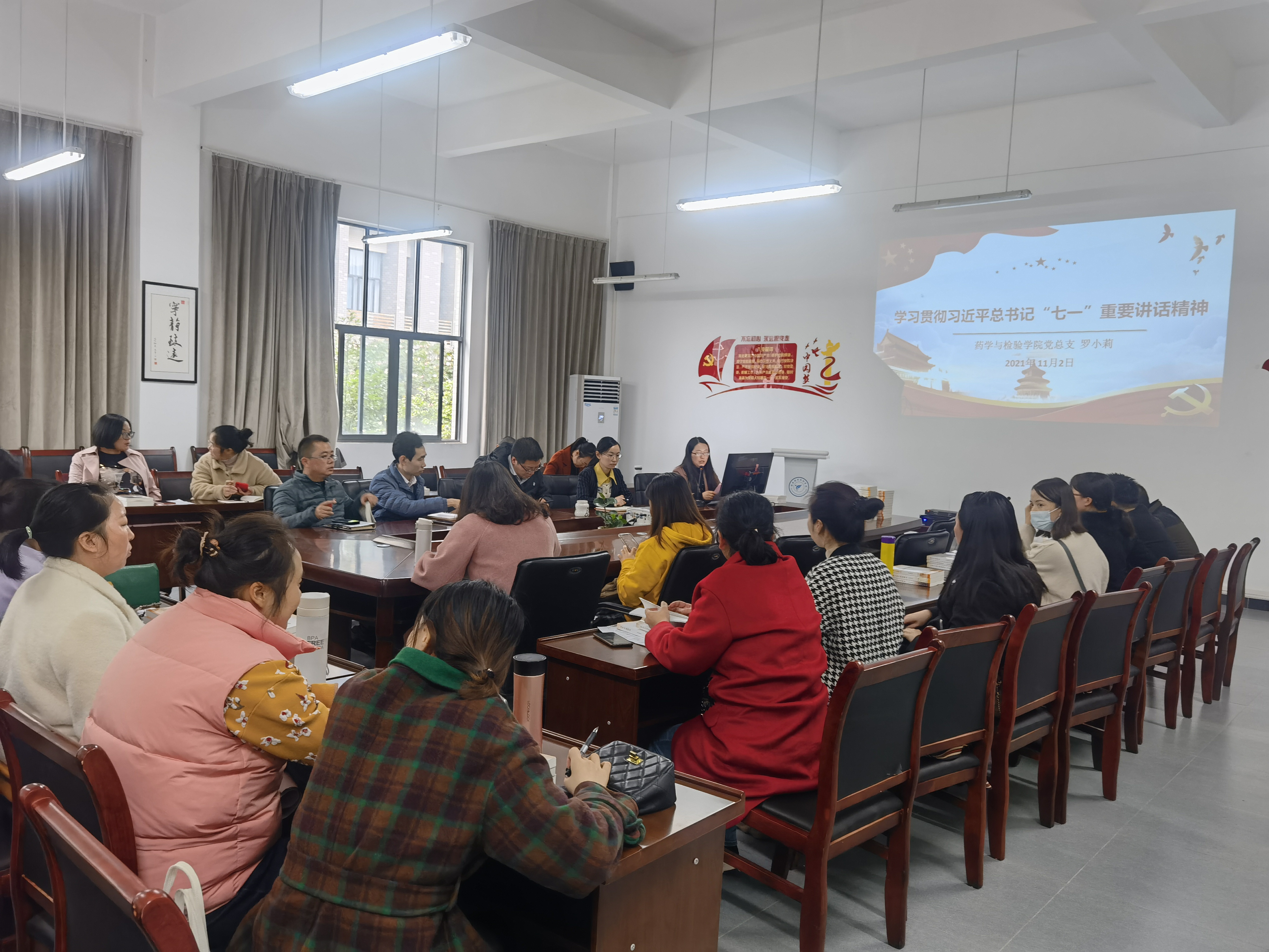 11月2日,药检公司党总支副书记罗小莉为全体教职员工再次领学习近平总书记“七一”重要讲话精神,旨在进一步深刻领会讲话精神的核心要义和具体内涵。此次学习也是党史学习教育暨党务工作者素能提升专题培训所学知识的交流。