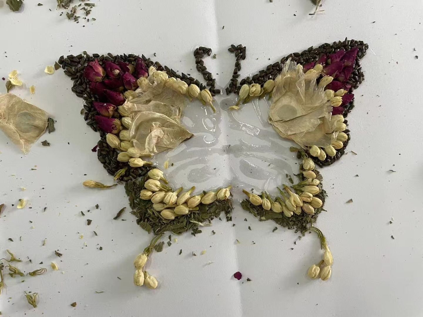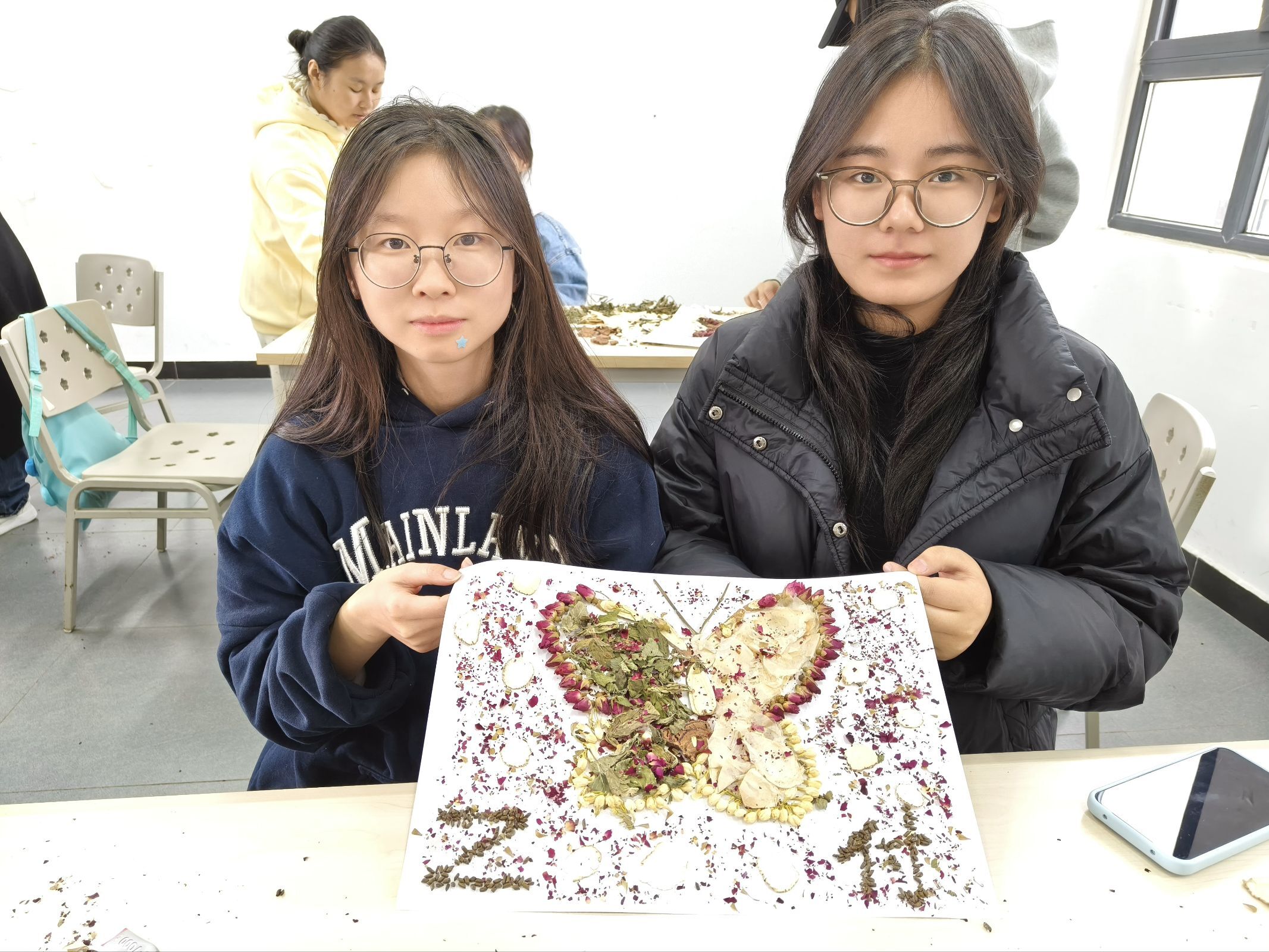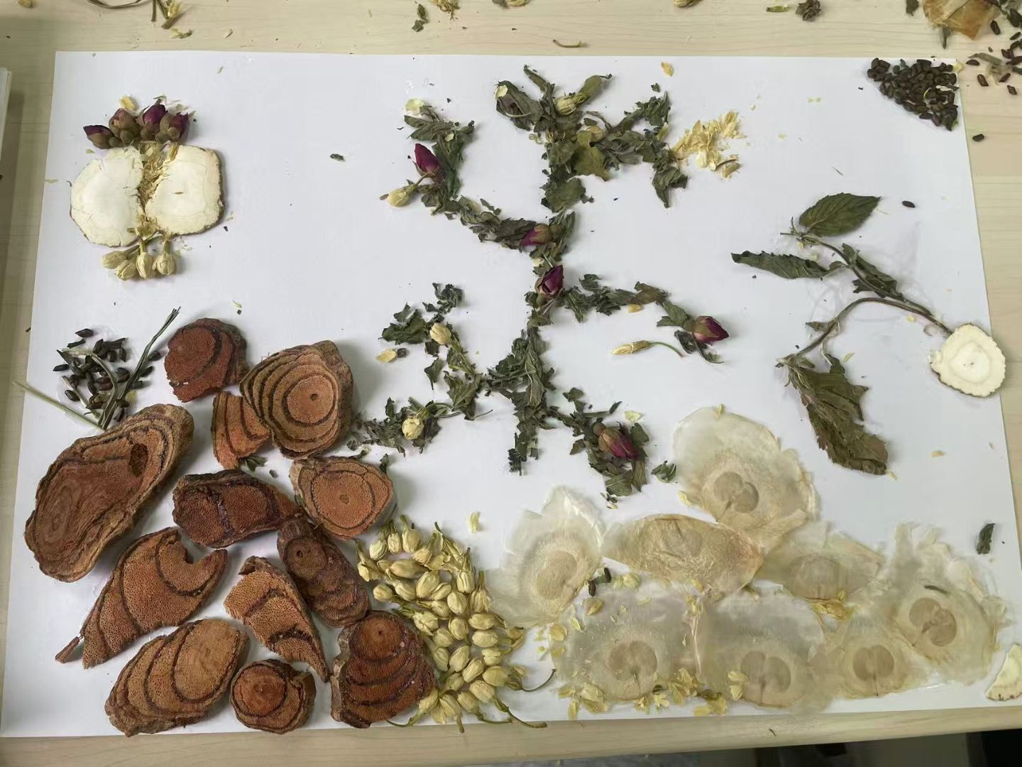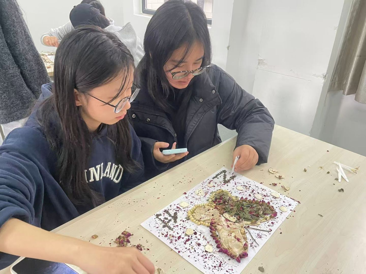 随后的动手环节将气氛推向高潮。同学们分组协作,化身“本草复原师”,在碎片中寻找线索,在拼接中沟通想法。有的仔细分拣带有药名的碎片,有的认真对照图纸调整位置,桌上零散的部件在团队的默契配合下,渐渐呈现出完整而精美的中草药图案。现场气氛热烈,洋溢着专注与合作的青春活力。