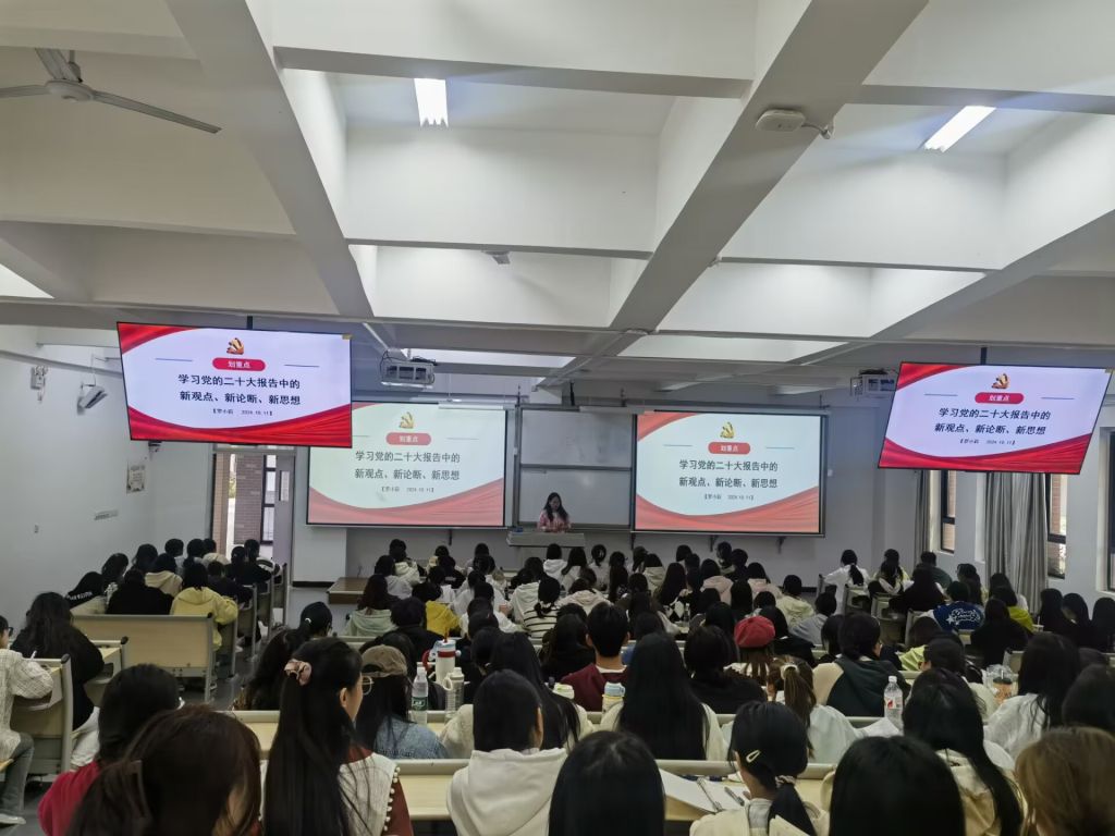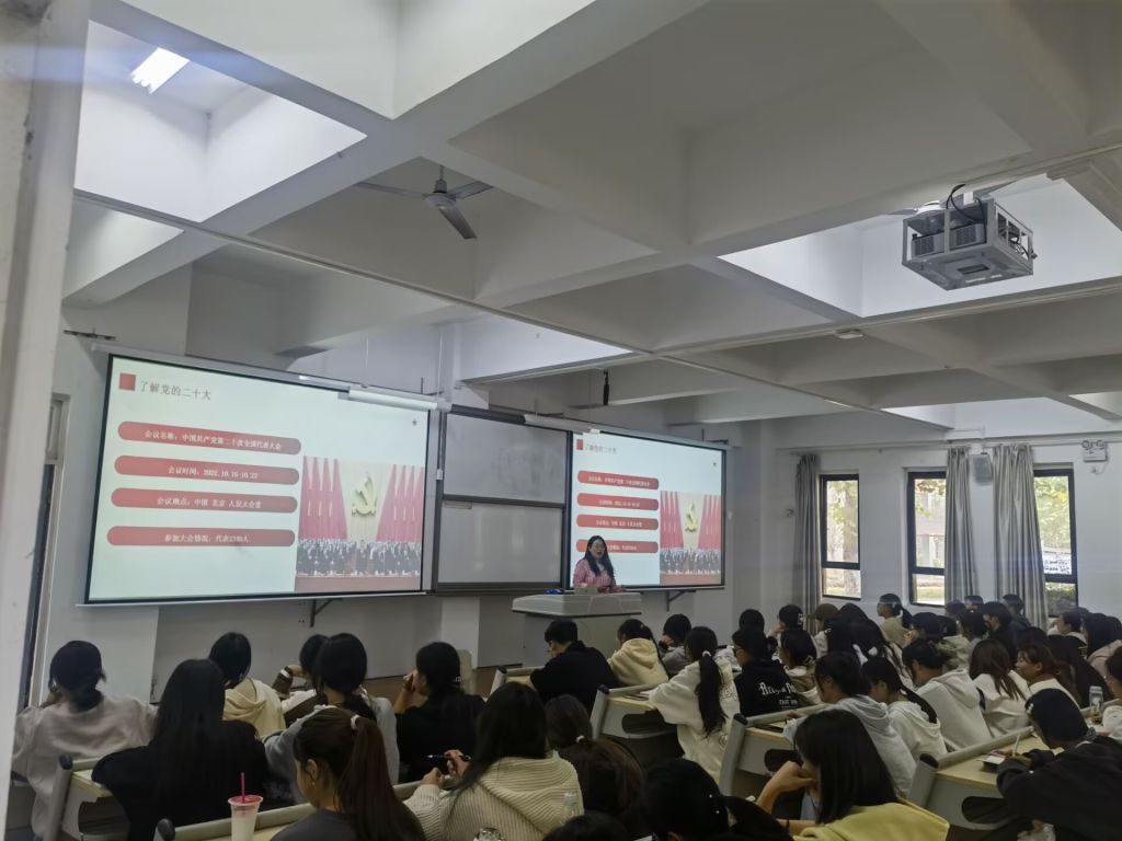 罗小莉老师围绕党的二十大概况、报告重点及金句解读等方面展开讲述,深刻阐述了党的二十大召开的历史意义、主要成果以及新时代中国特色社会主义的发展蓝图。为增强学习的直观性和互动性,罗老师还为同学们播放了相关视频,展示新中国的发展和变迁之路,通过生动的讲解和详实的数据分析,让同学们对党的二十大精神有了更加全面和深入的理解。