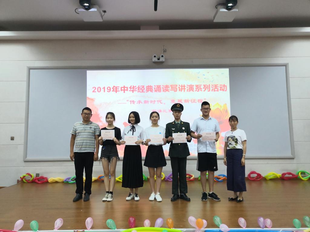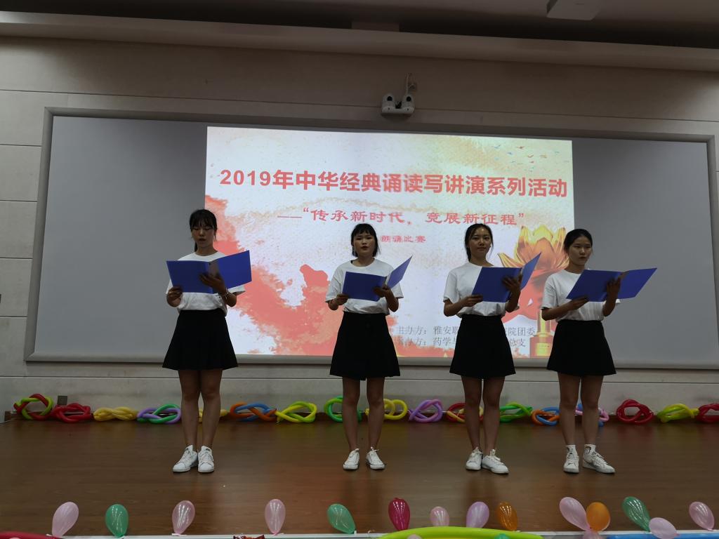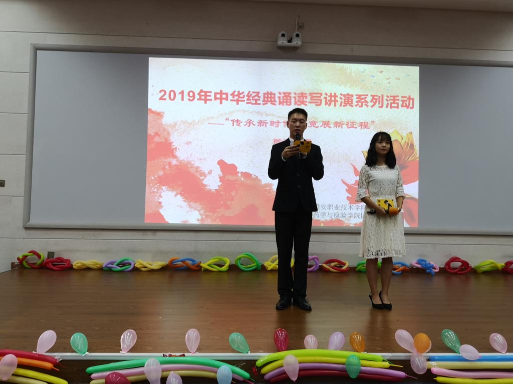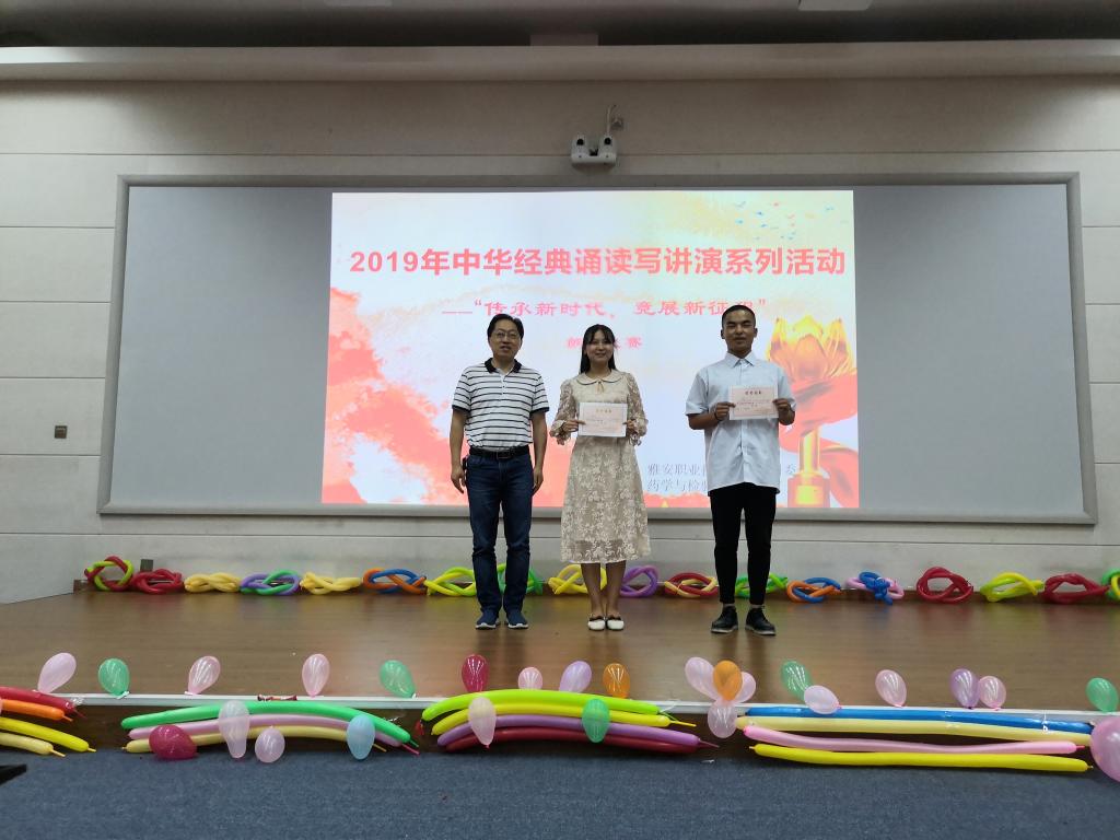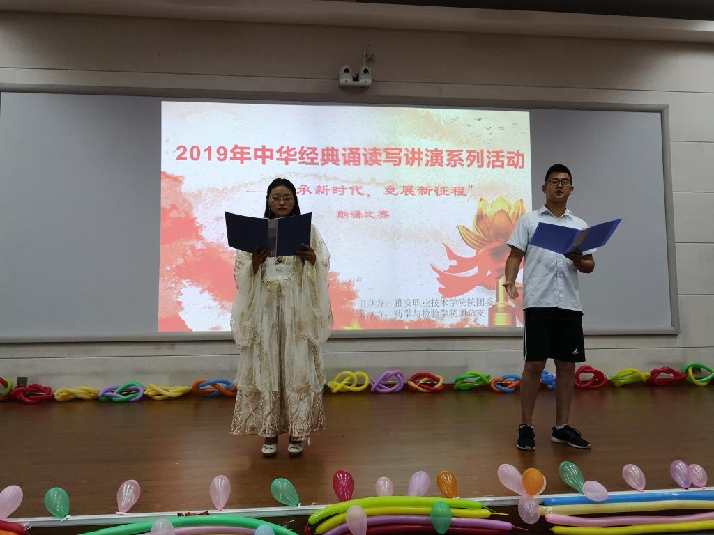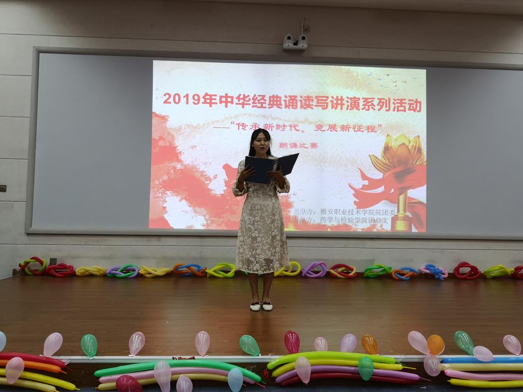 为庆祝新中国成立70周年,五四爱国运动100周年,引导员工共抒爱国情怀,传承经典美德,展示新时代青年的良好精神面貌。6月20日12:30,太阳集团122cc成功承办了雅职院2019年中华经典诵读写讲演系列活动之“传承新时代,竞展新征程”的朗诵比赛。药检公司党总支书记杨泽刚、药检公司团总支书记鲜敏、辅导员何群、杨伍哈、徐赛、姚永秀老师担任本次比赛评委。比赛在经开区2204多媒体教室举行,共计100余人观赛。