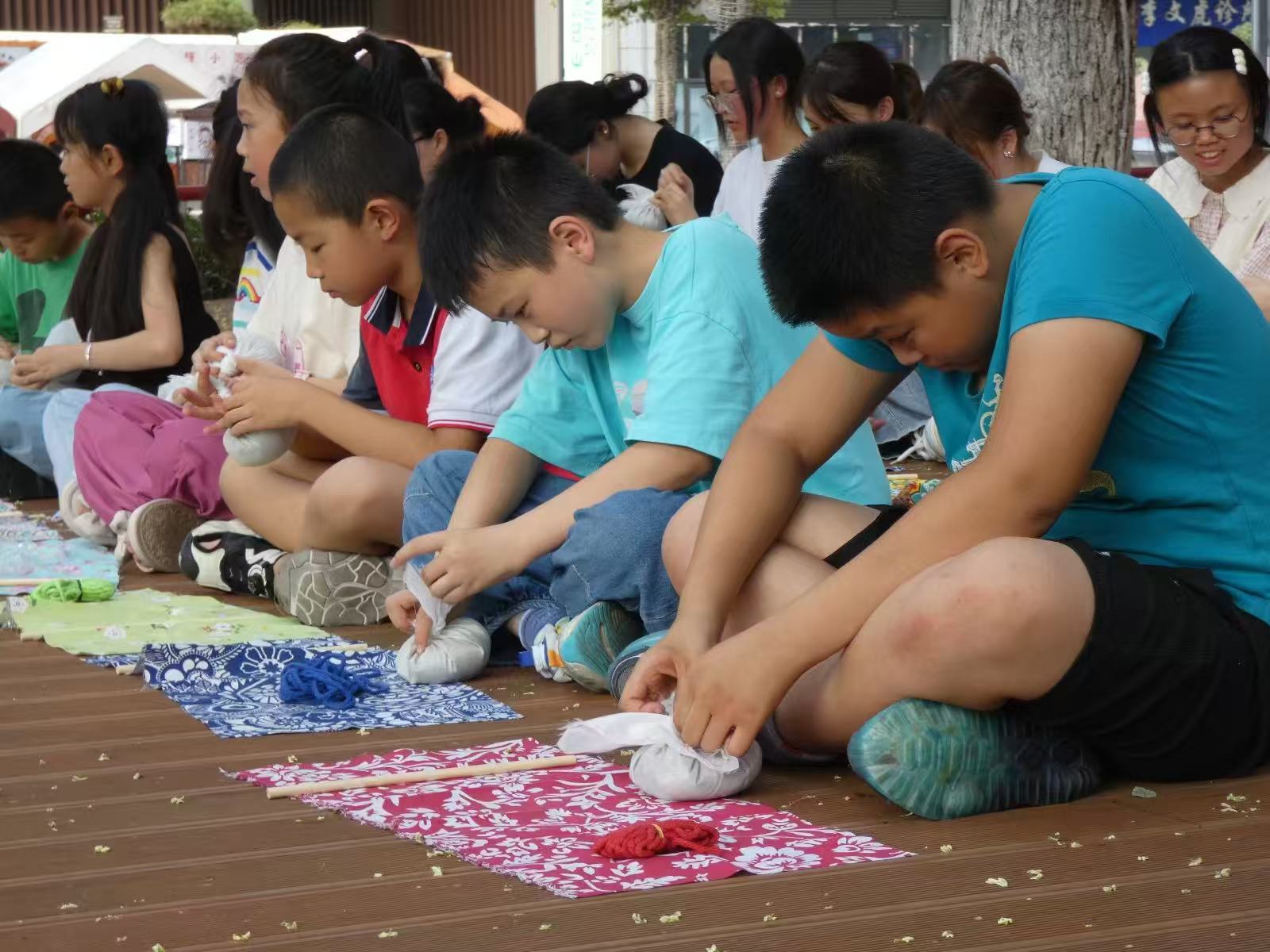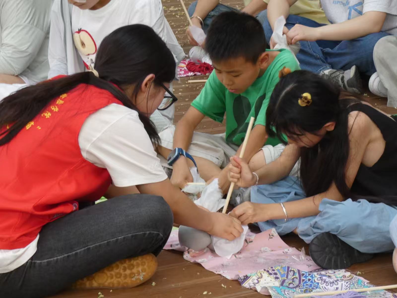 活动采用“三分组”协同模式。技艺教学组:专业示范艾草锤制作要诀,重点讲解“三指握距”“十字捆扎法”等核心技巧;现场指导组:一对一协助小朋友完成艾草整理、棉布包裹、麻绳固定等工序;影像记录组:全程捕捉孩子们专注制作的精彩瞬间。“原来捆扎力度这么讲究!”参与活动的乐乐小朋友兴奋地说。在志愿者引导下,孩子们通过“看——学——做”的沉浸式体验,不仅掌握了“松而不散,紧而不僵”的制作精髓,更体会到传统手工艺的匠心精神。